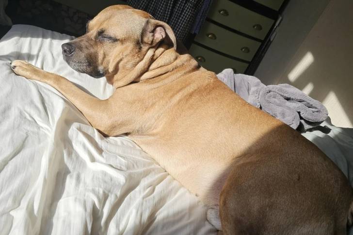 Un American Bully Staffy Bull Terrier allongé sur un lit