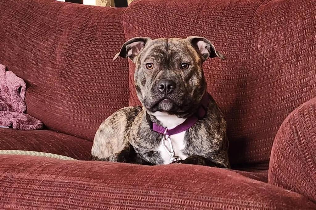 Un American Bully Staffy Bull Terrier allongé sur un canapé et portant un collier autour du cou