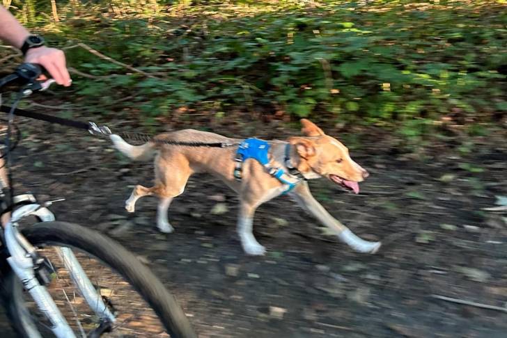 Un American Dingo portant un harnais et courant à côté d'un cycliste