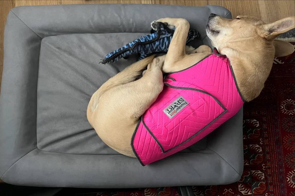 Un American Dingo allongé sur un panier pour chien et portant un harnais