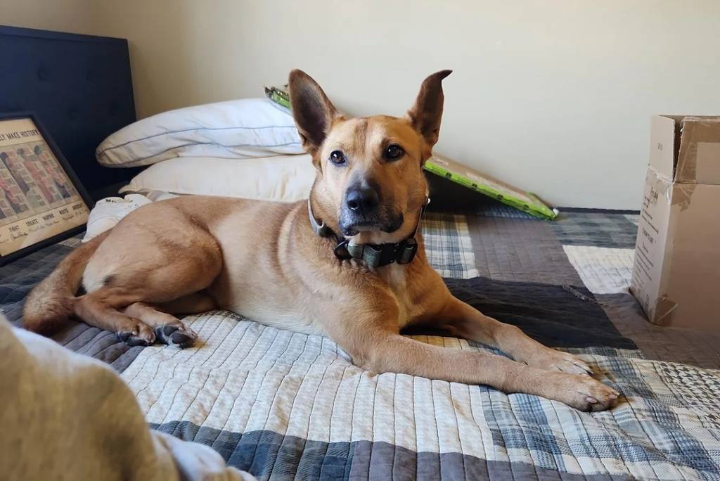 Un American Dingo allongé sur un lit et portant un collier au cou