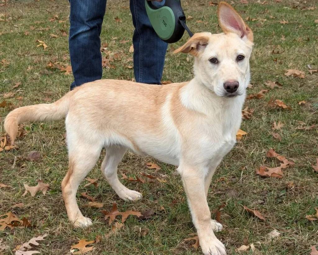 Un American Dingo sur un terrain herbeux et tenu en laisse