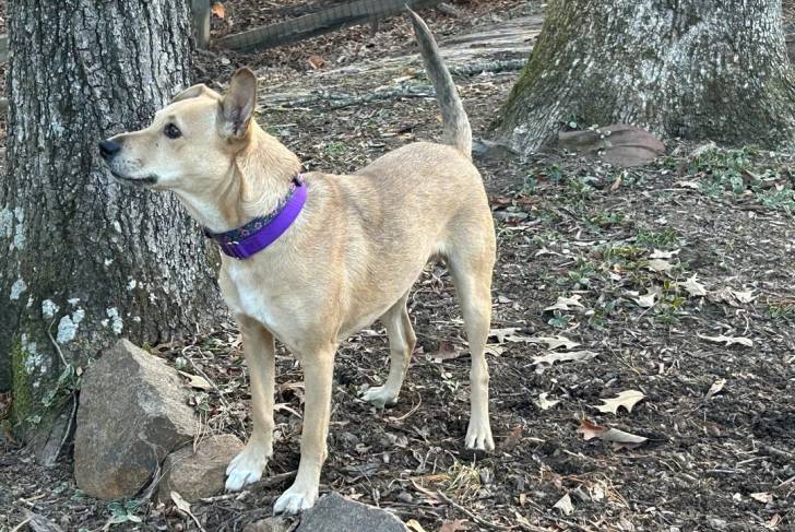 Un American Dingo se tenant à côté d'un arbre et portant un collier au cou