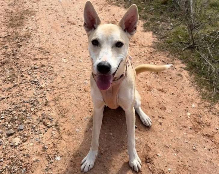 Un American Dingo assis sur une surface sableuse et portant un harnais