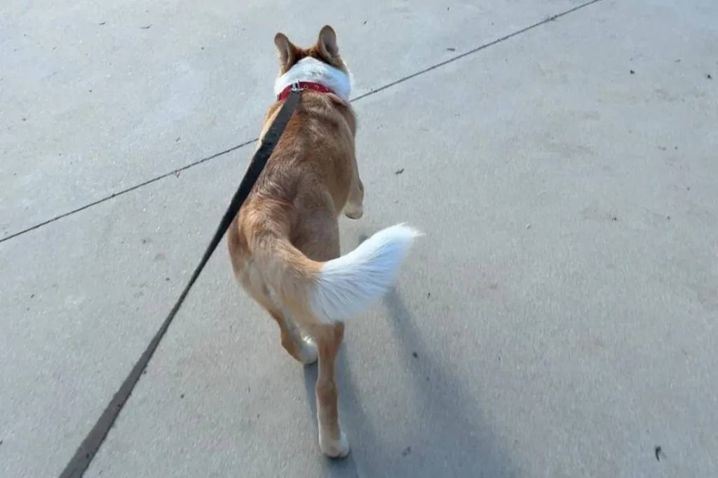 Un American Dingo marchant sur une surface bétonné et tenu en laisse