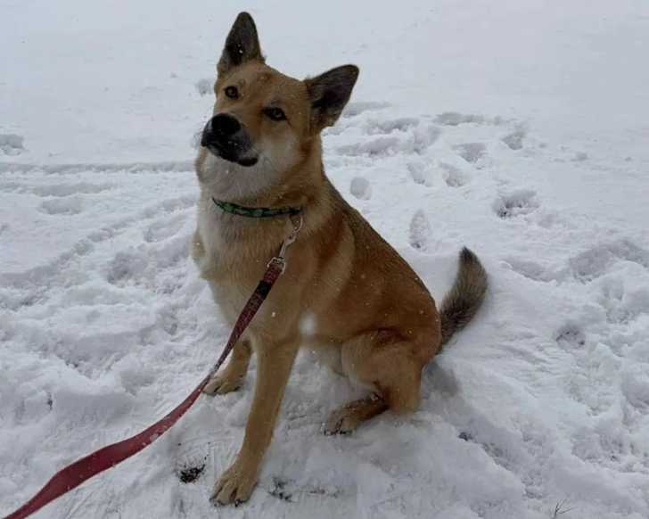 Un American Dingo assis sur une surface enneigée et tenu en laisse