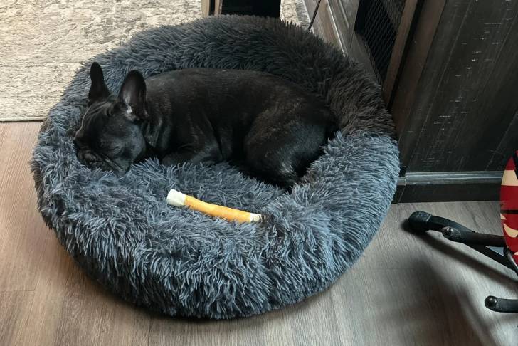 Un American French Bulldog allongé sur un panier et semblant dormir