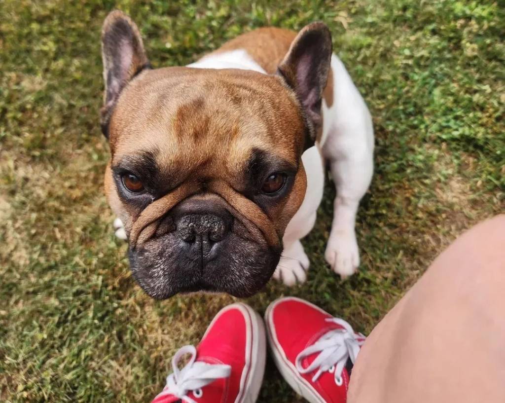 Un American French Bulldog assis sur un terrain herbeux et regardant vers la caméra