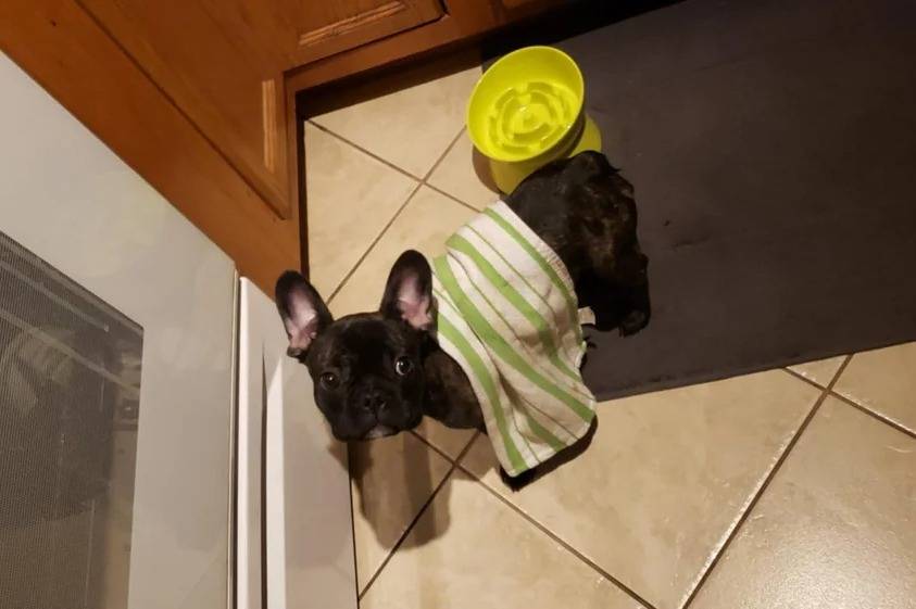 Un American French Bulldog sur un tapis et regardant vers la caméra