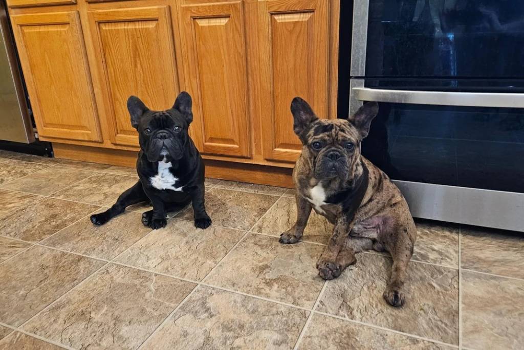 Deux American French Bulldog assis sur un sol carrelé