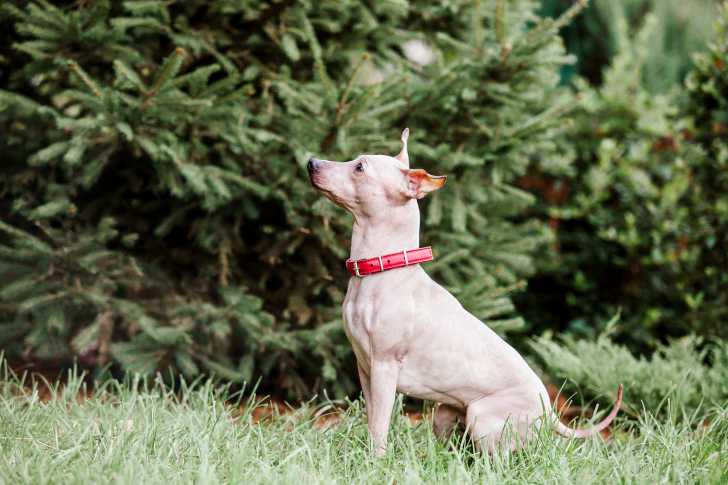 Un American Hairless Terrier beige avec un collier rouge assis dans l'herbe
