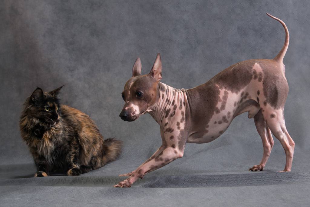 Un American Hairless Terrier lors d'une séance photo avec un chat