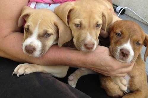 Trois Americans Pits Corsos tenus dans les bras d'une personne