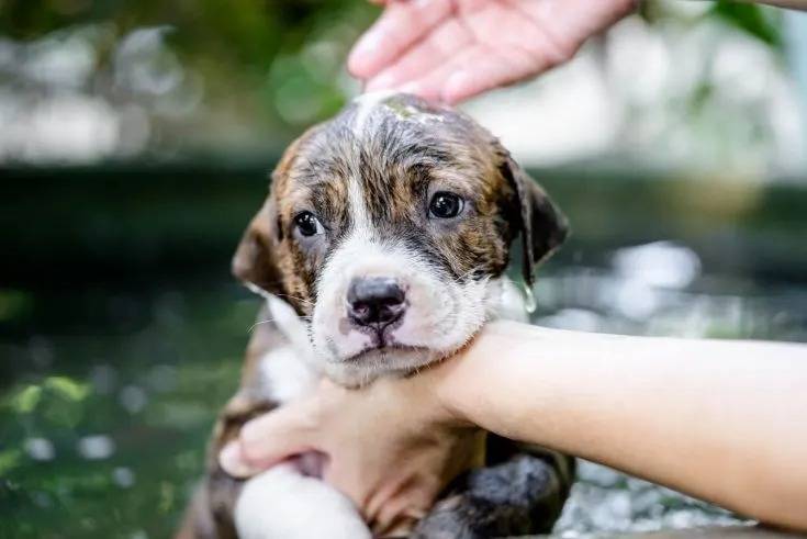 Photo d'une personne touchant le ventre d'un American Pit Corso qui fait face à la caméra