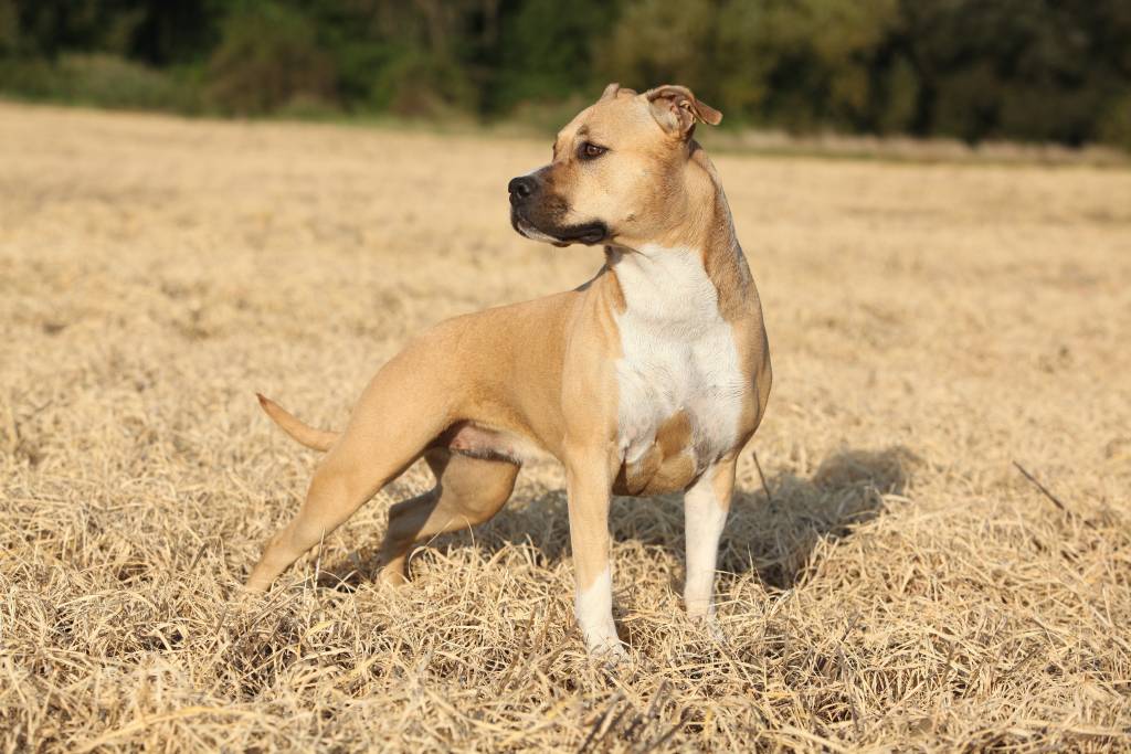 Un American Staffordshire Terrier beige en position statique