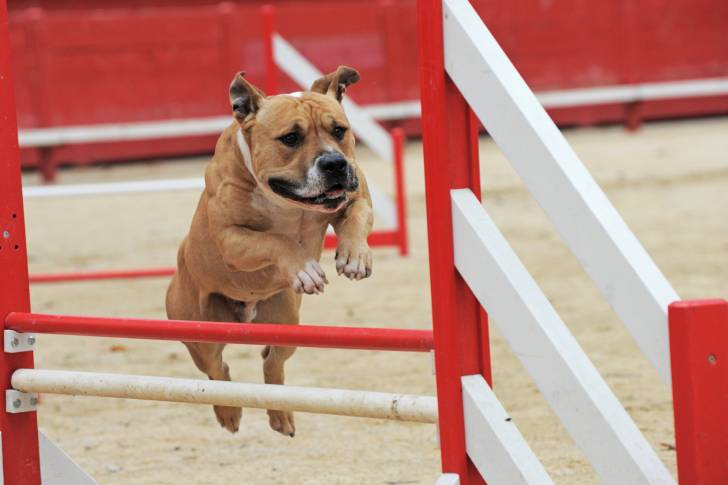 Un American Staffordshire Terrier qui franchit une haie d'agility