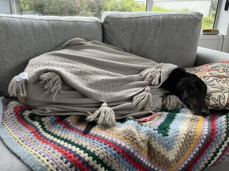 Un American Staghound allongé sur un canapé et recouvert d'une couverture