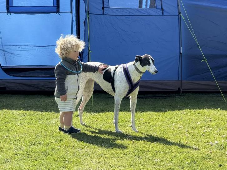 Un American Staghound sur un terrain herbeux portant un harnais à côté d'un enfant