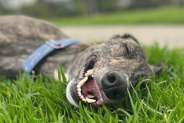 Un American Staghound allongé sur un terrain gazonné et portant un collier au cou