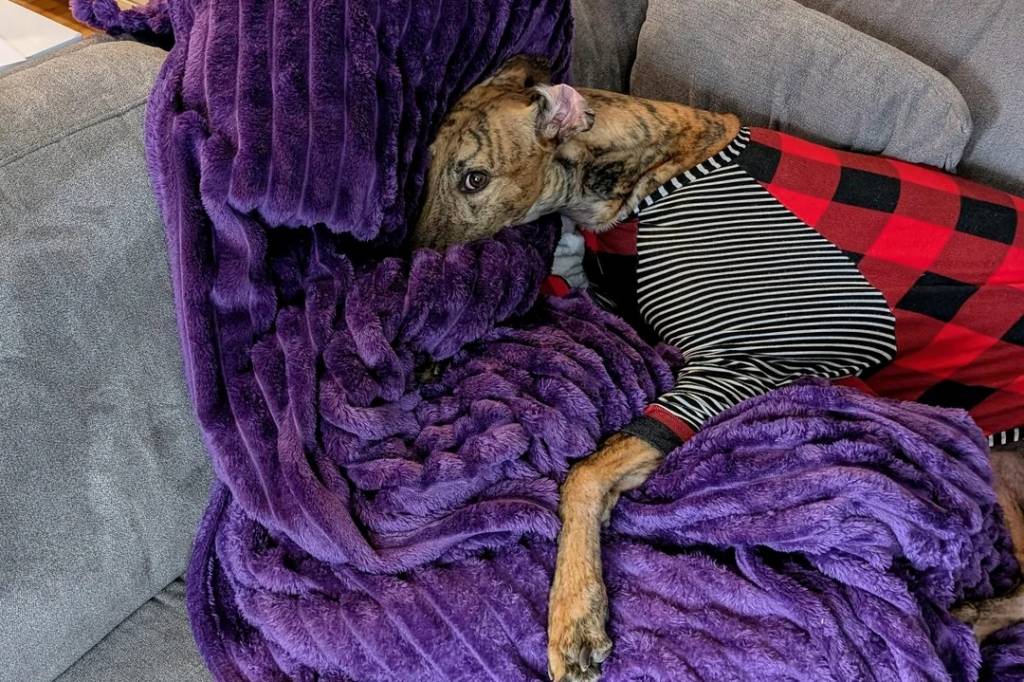 Un American Staghound allongé sur un canapé et portant un manteau pour chien