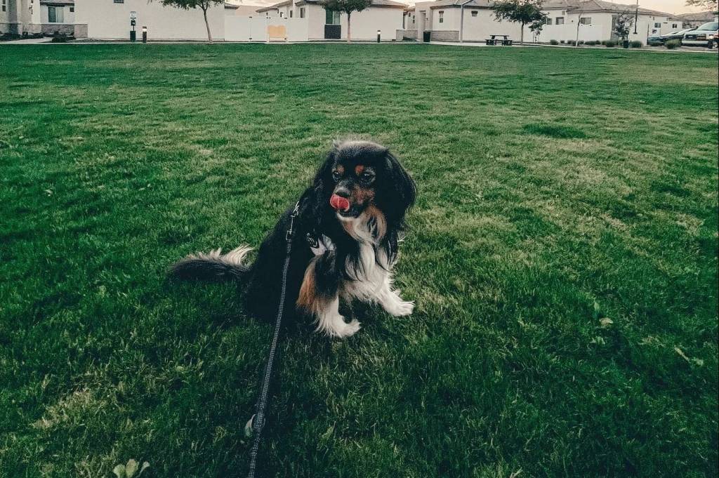 Un Aussalier assis sur une surface herbacée et qui est tenu en laisse