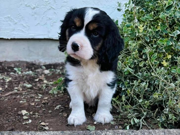 Un chiot Aussalier assis sur une surface sableuse et semblant détendu