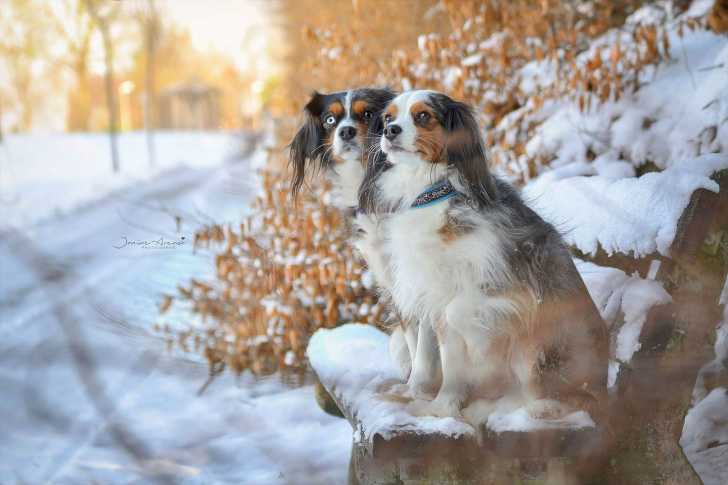 Deux Aussalier assis sur un banc enneigée et portant tous deux un collier autour du cou