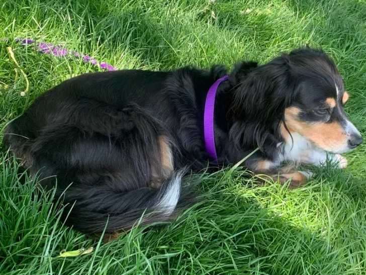 Un Aussalier allongé sur une surface herbacée et portant un collier autour du cou