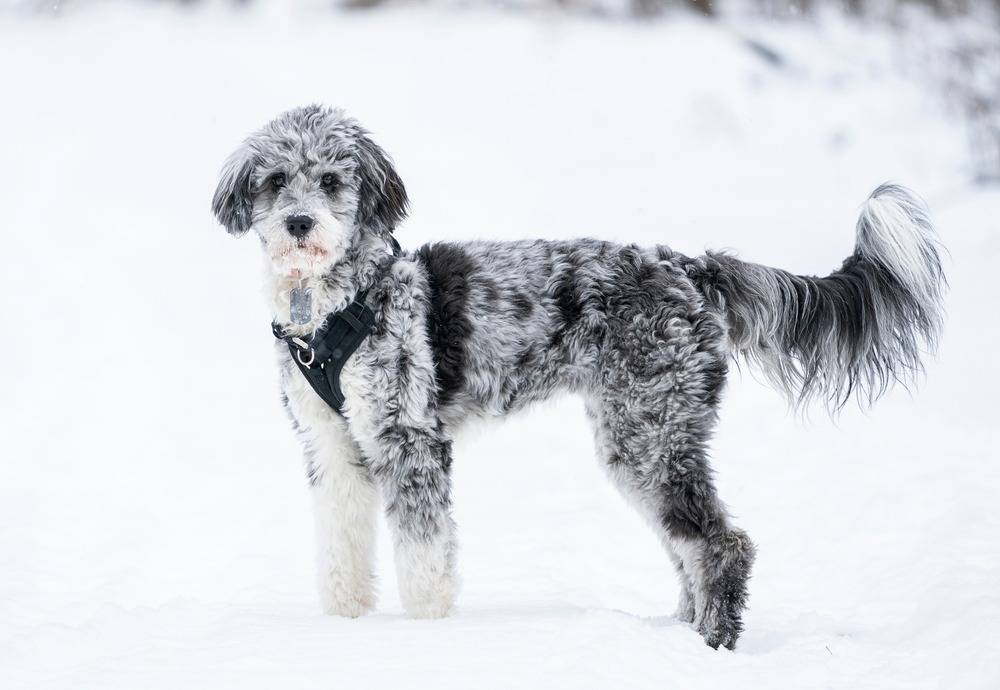 Un  Aussiedoodle dans la neige avec son harnais autour du cou