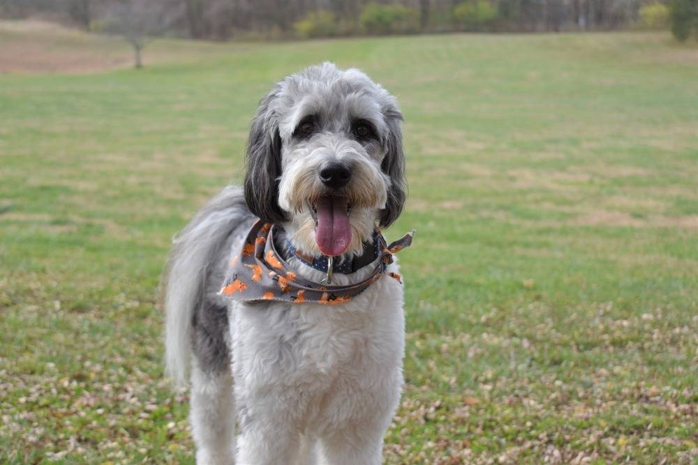 Un Aussiedoodle sur ses quatre pattes, seul au milieu d'un champ avec un bandana