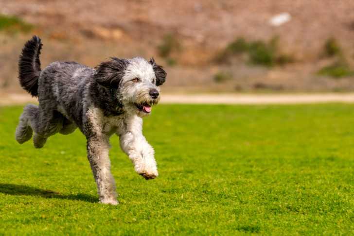 Un Aussiedoodle qui court dans l'herbe