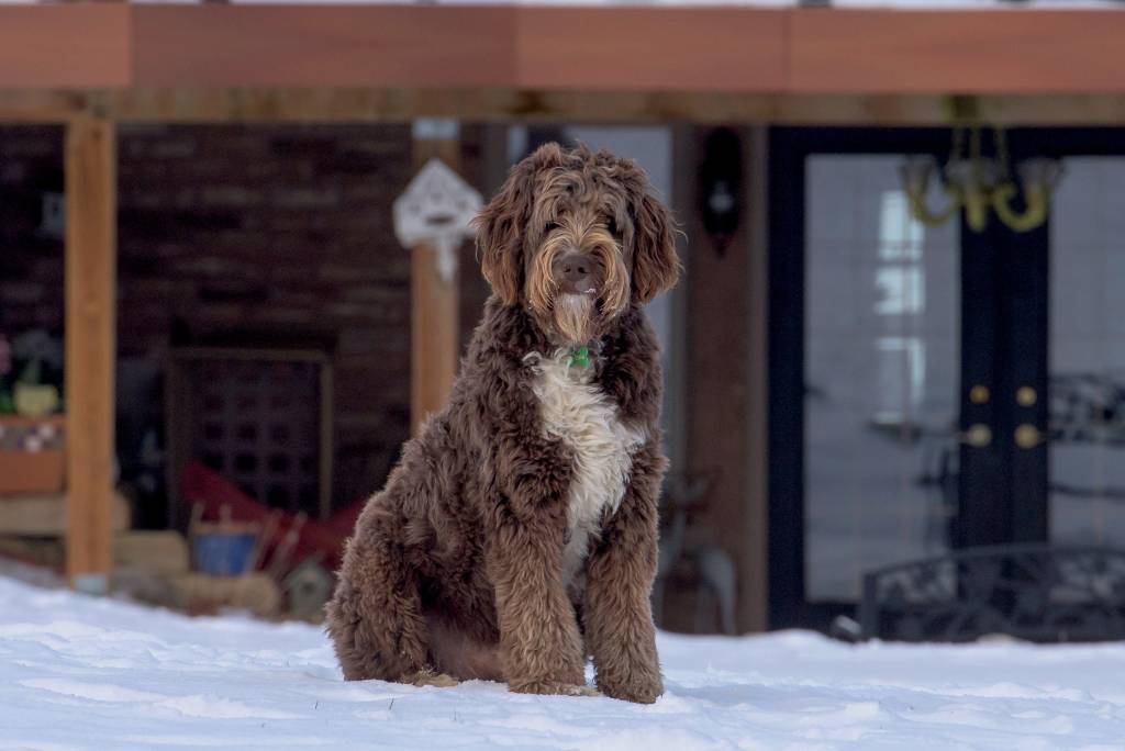Un Aussiedoodle au pelage roux, assis dans la neige
