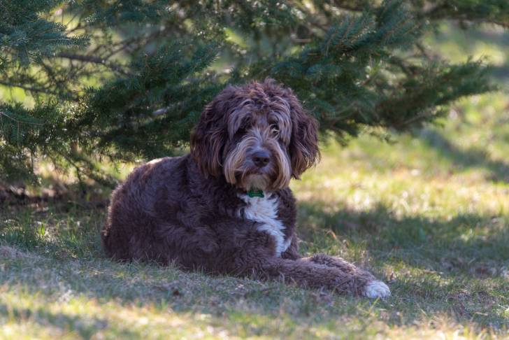 Un Aussiedoodle au pelage roux allongé sur l’herbe, à l’ombre d’un sapin