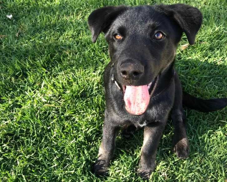 Un Aussiedor ayant la langue pendante et portant un collier autour du cou