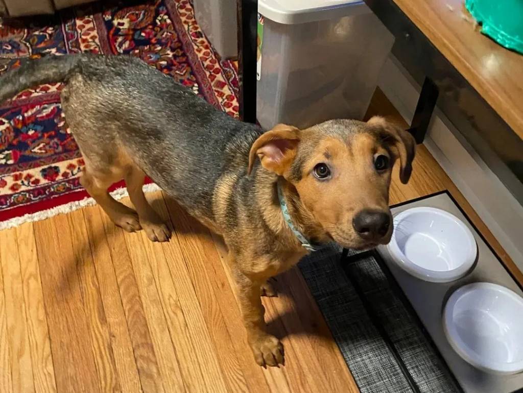Un Aussiedor sur un plancher et portant un collier autour du cou