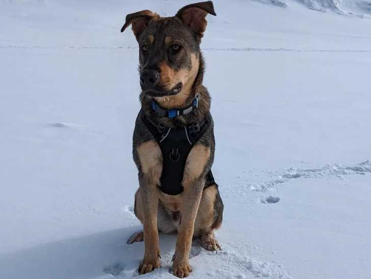 Un Aussiedor assis sur une surface enneigée et portant un harnais