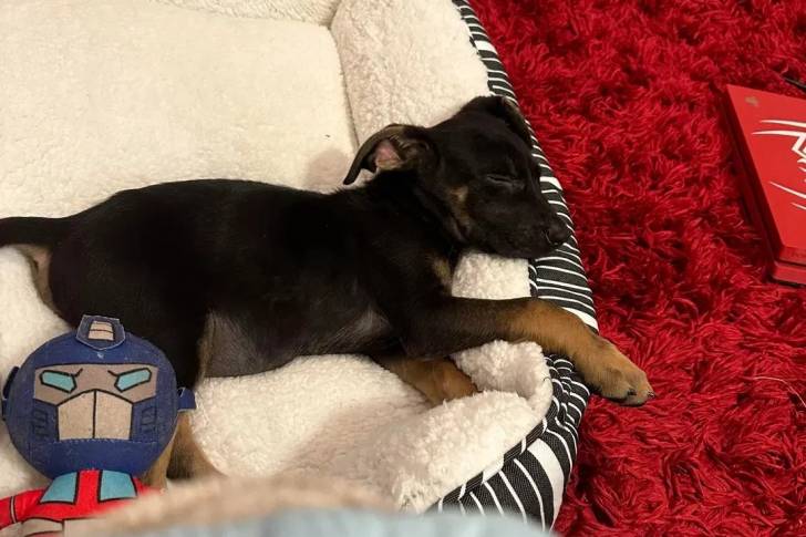 Un Aussiedor allongé dans un panier et semblant dormir