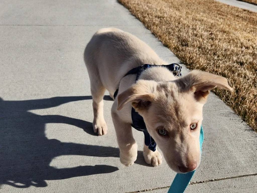Un Aussiedor marchant sur une surface bétonnée et qui est tenu en laisse