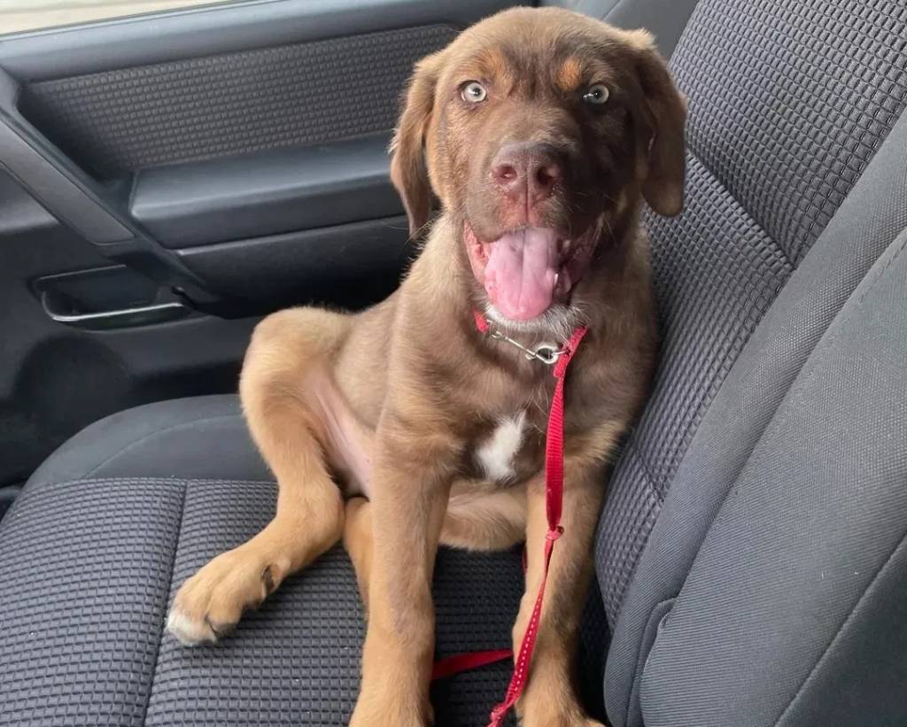 Un Aussiedor assis sur le siège d'une voiture et qui est tenu en laisse