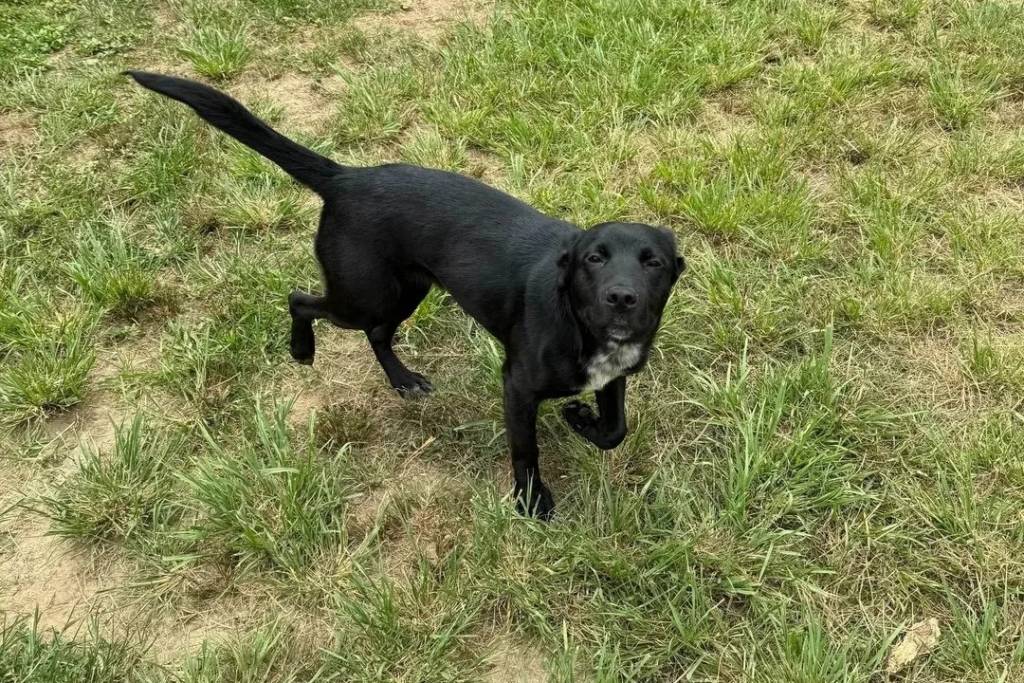 Un Aussiedor sur un terrain herbeux et regardant vers la caméra