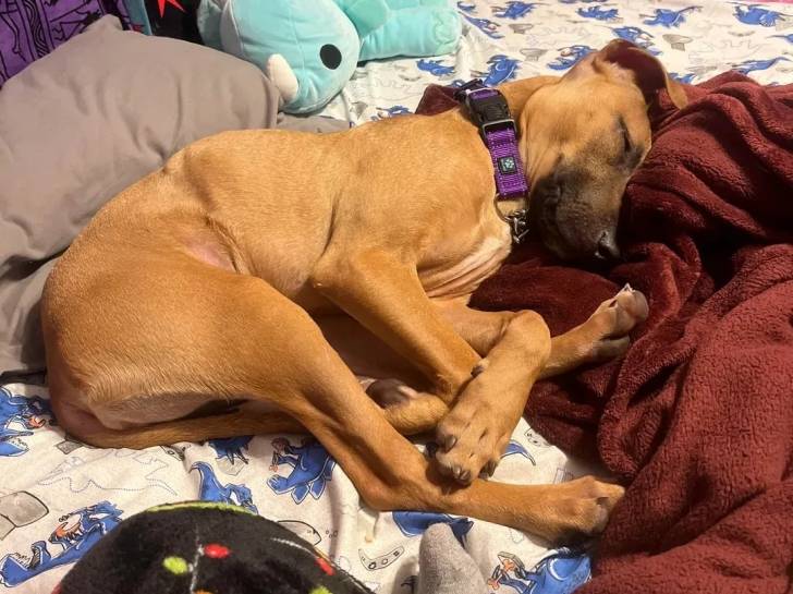 Un Aussiedor allongé et portant un collier autour du cou
