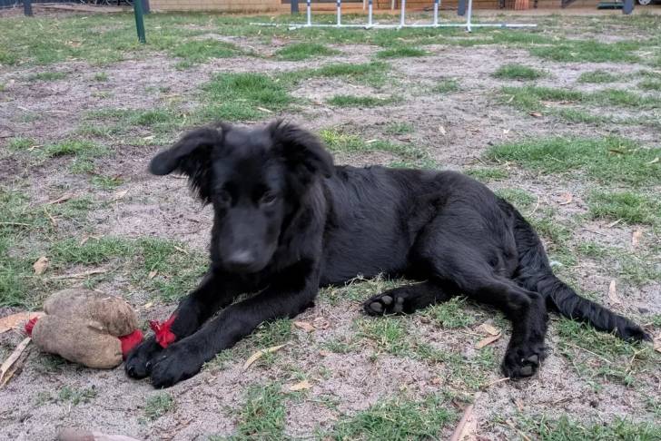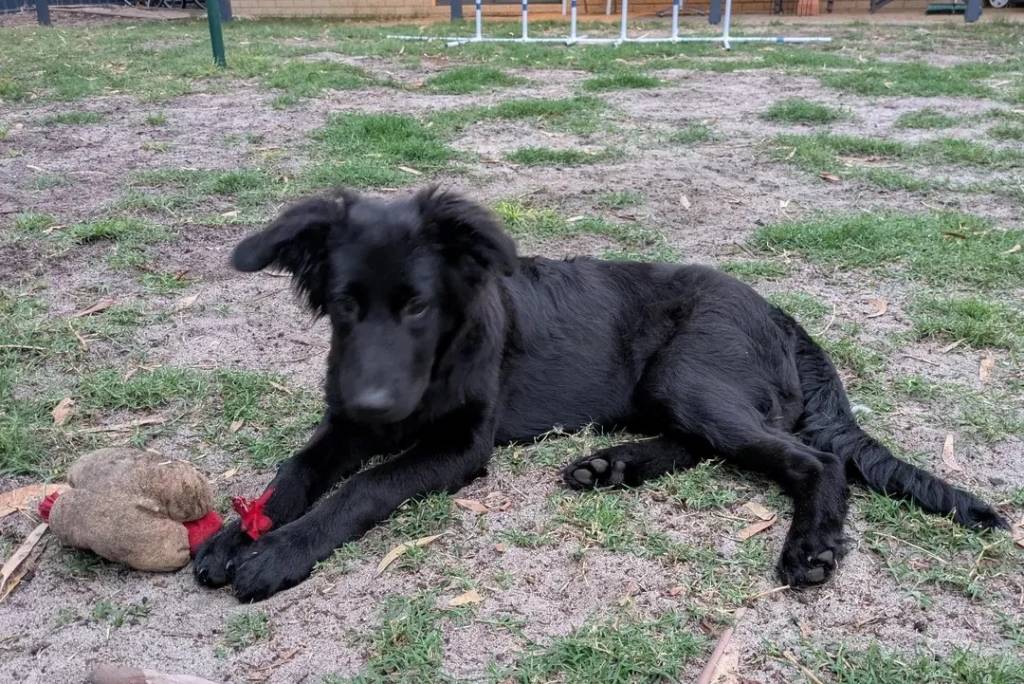 Un Aussiedor allongé sur un terrain herbeux et semblant détendu