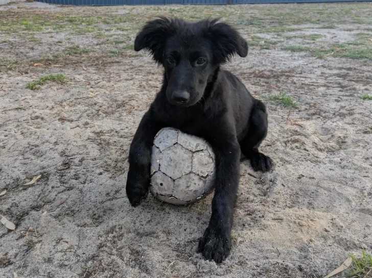 Un Aussiedor sur une surface sableuse et ayant une patte posé sur un ballon