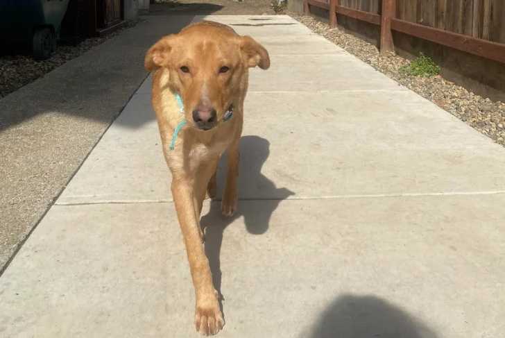 Un Aussiedor marchant sur une surface bétonnée et portant un collier autour du cou
