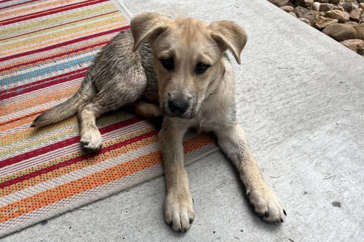 Un Aussiedor allongé sur un tapis et semblant détendu