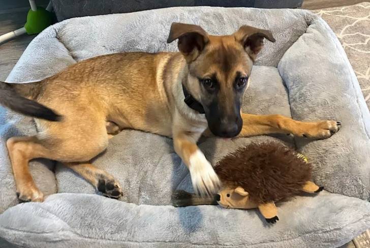 Un Aussiedor allongé dans un panier et portant un collier autour du cou
