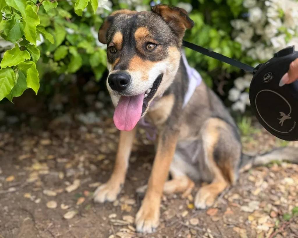 Un Aussiedor ayant la langue pendante et qui est tenu en laisse