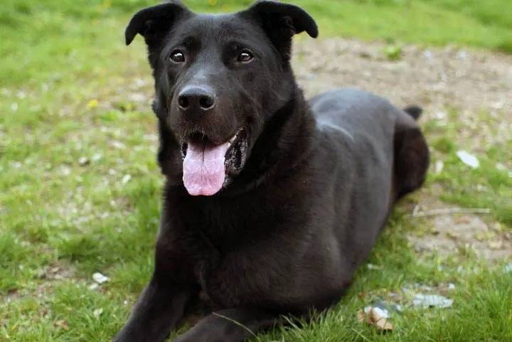 Un Aussiedor allongé sur une surface gazonnée et ayant la langue pendante