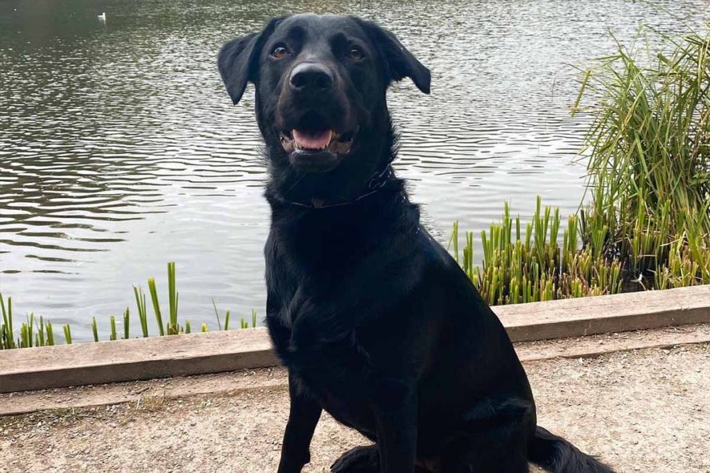 Un Aussiedor portant un collier autour du cou et ayant la gueule ouverte