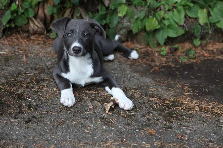 Un Aussiedor allongé sur une surface herbacée et regardant vers la caméra